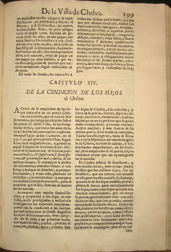 “Son todos los hijos naturales de Chelva, de su naturaleza, tan dados al trabajo, tan briosos, tan admirables, tan gigantes en sus fuerças, y tan conocidos por tales en el Reyno de Valencia, y en estos contornos de Aragon y Castilla, que en cualquier parte que llegan a conducirse, les pagan mucho mayor sueldo que los demás; y quedan tan reventados, que a los 50 años, yà son como viejos de 70”.